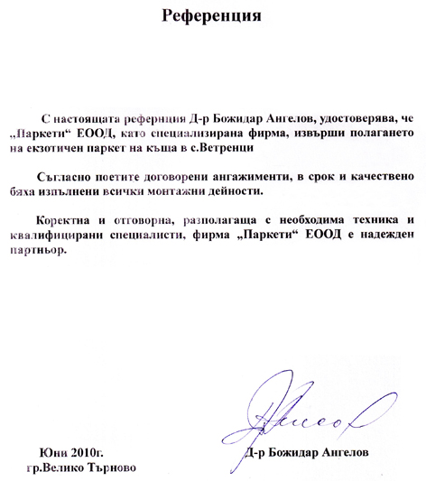 | • С настоящата референция д-р Божидар Ангелов, удостоверява че Паркети ЕООД, като специализирана фирма, извърши полагането на екзотичен паркет на къща в с.Ветренци. |