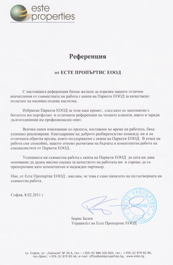 | • С настоящата референция бихме желали да изразим нашите отлични впечатления от съвместната ни работа с Паркети ЕООД... |
