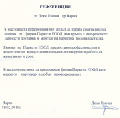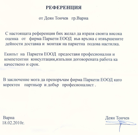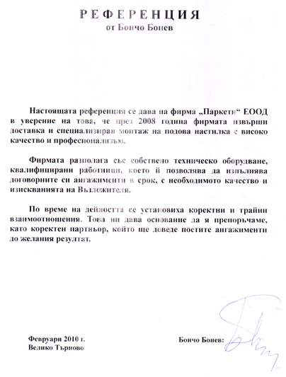 | • Настоящата референция се дава на фирма „Паркети“ ЕООД в уверение на това, че през 2008 година фирмата извърши доставка и специализиран монтаж на подова настилка с високо качество и професионализъм… |